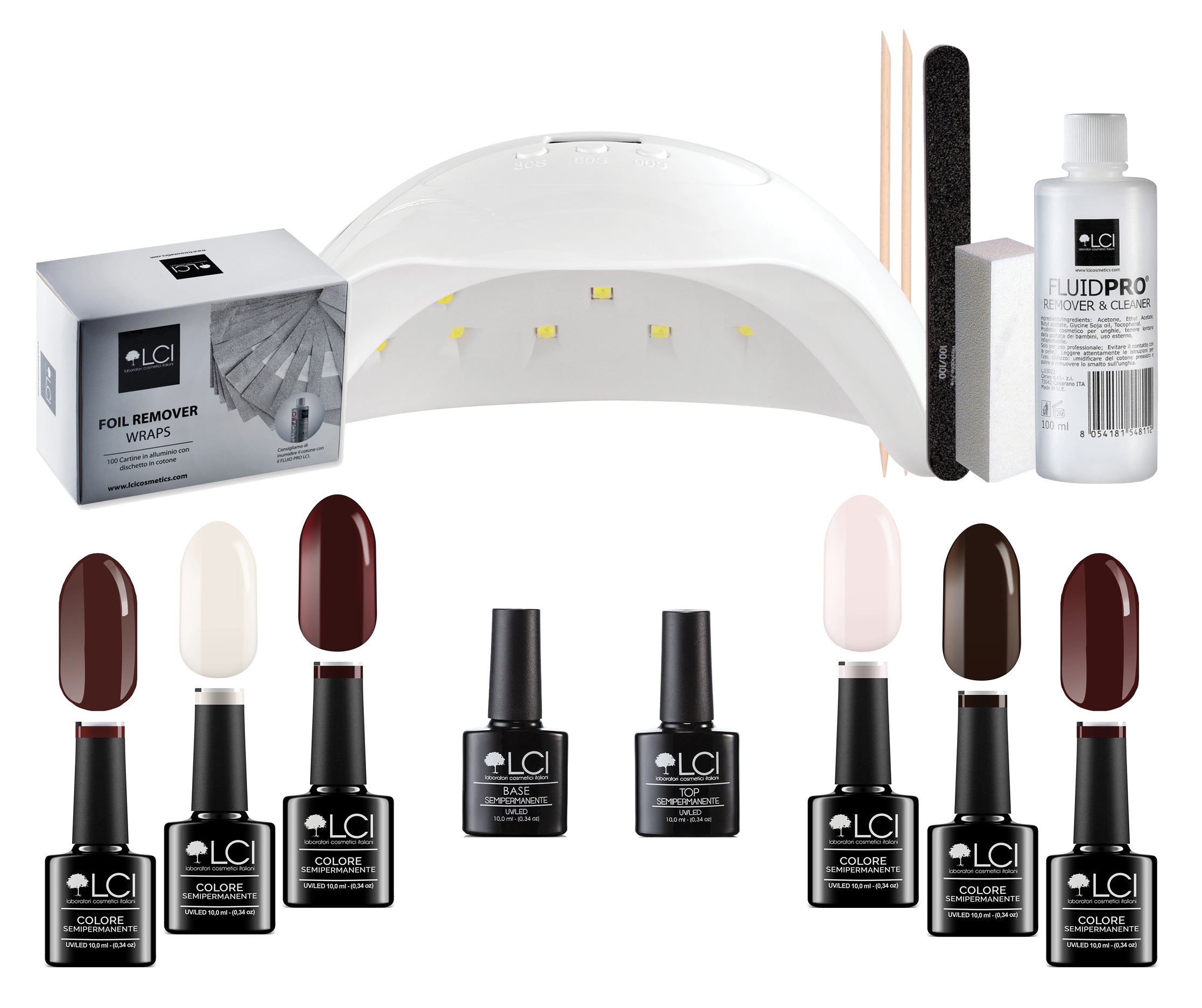 Accessori: Colore - Base - Top - Pad cotone pressato - Cleaner - FluidPro® - Lampada UV o LED - Olio Cuticole