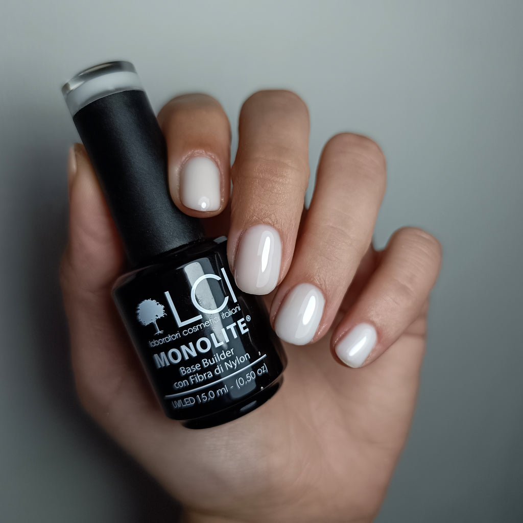 MONOLITE Base è una base ibrida forte con fibre di nylon per compiti speciali. Può essere applicato direttamente sulla unghia naturale (come base) e anche come strato che costruisce e estende l'unghia - max 3 mm